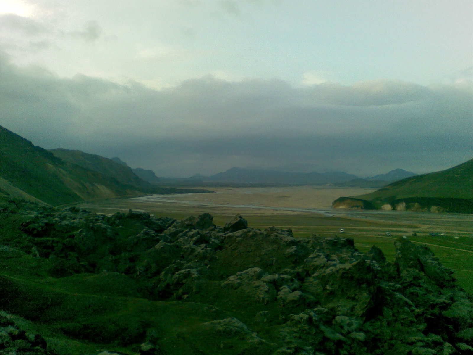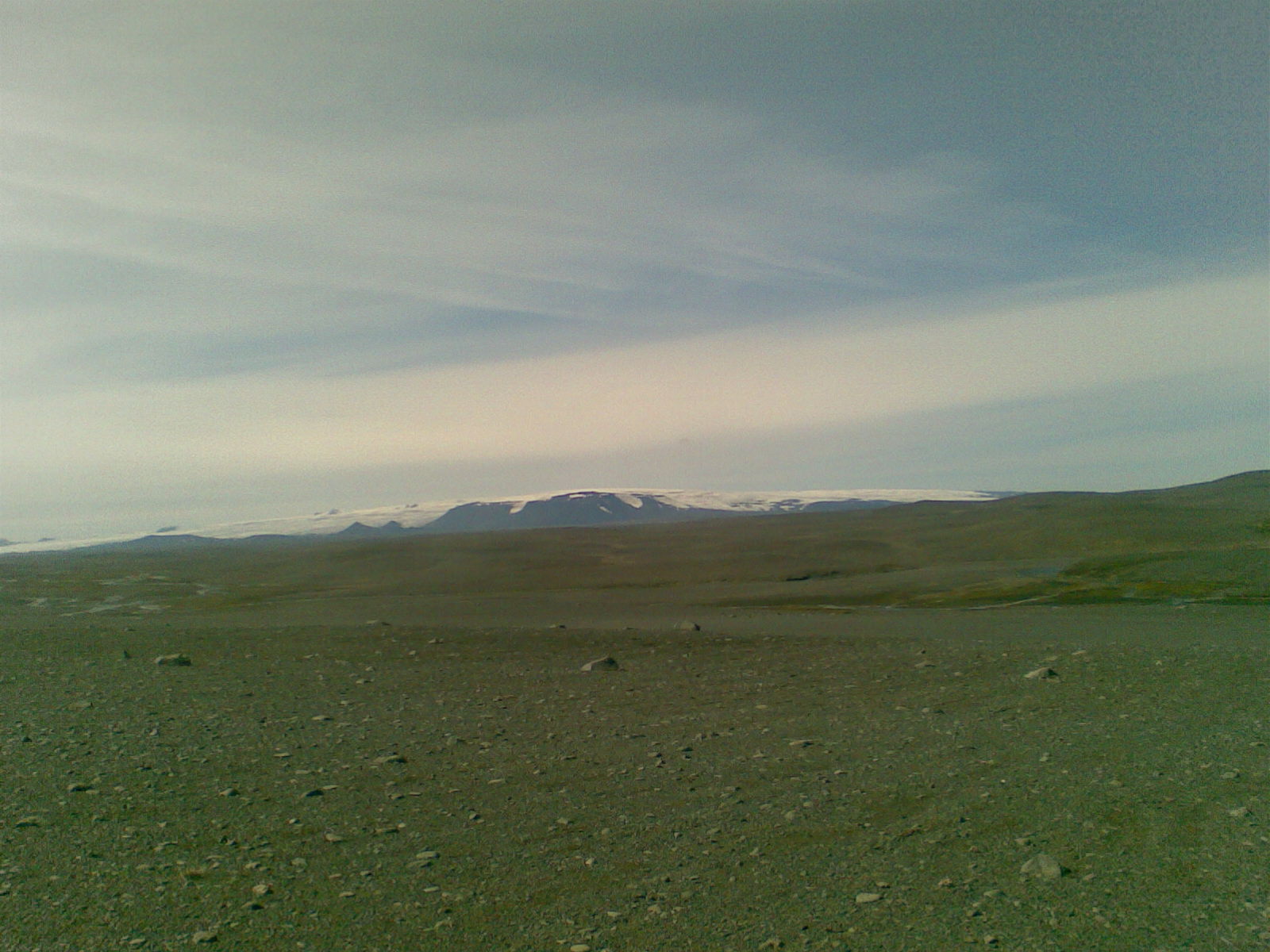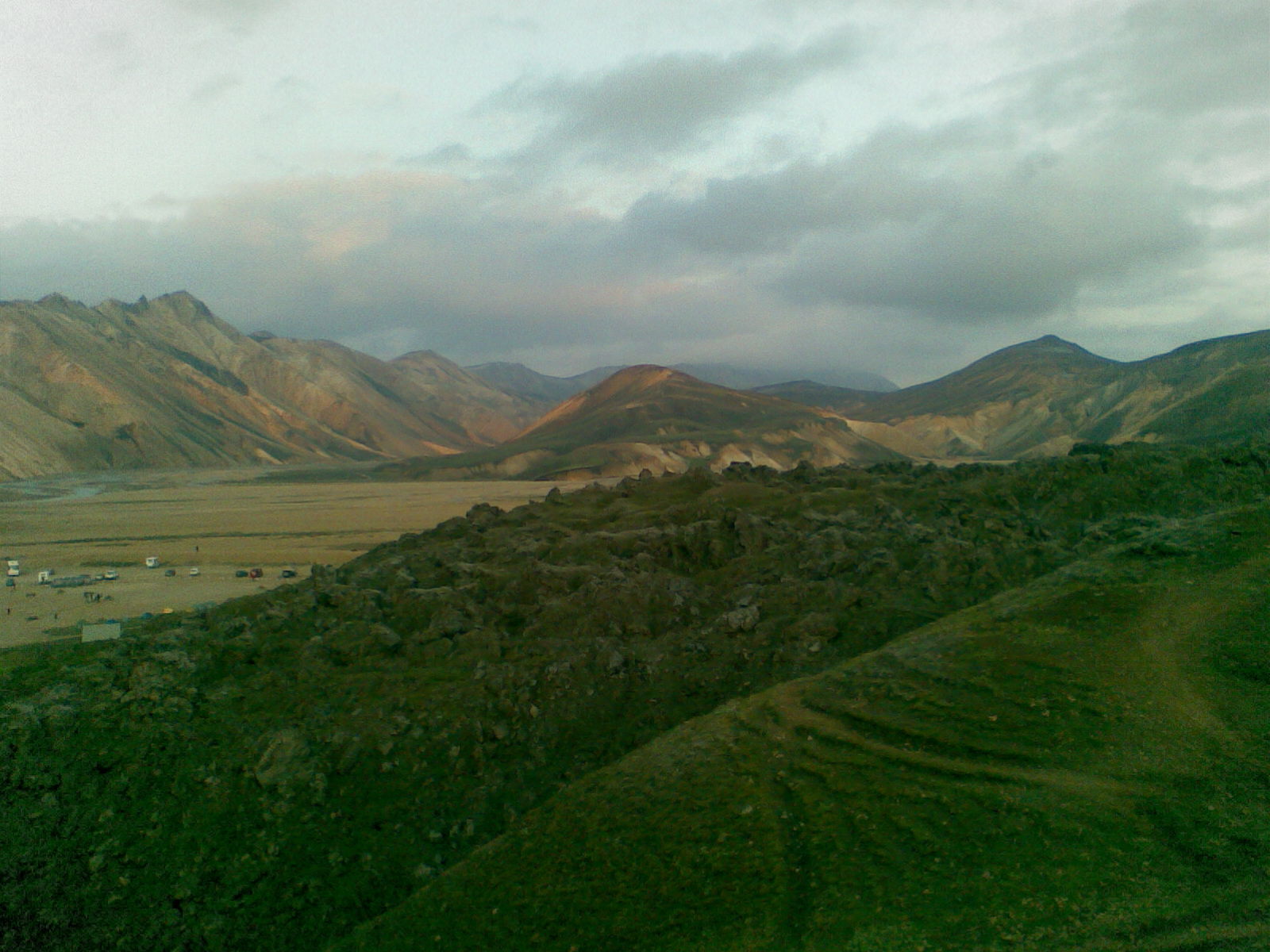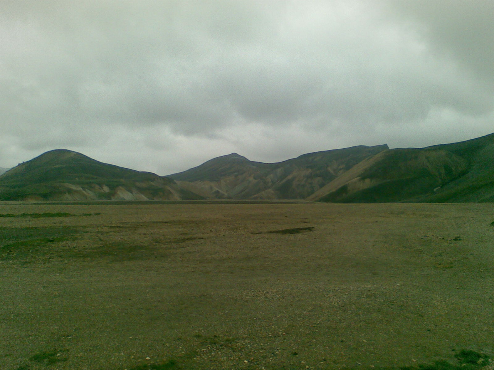 Het binnenland is meer vlak, op de uitgesleten rivier met watervallen na, en je hebt prima zicht op de witte vlekken op de kaart; gletcher #3 qua oppervlak en meer. Het gebied bij Landmannalauger is meer bergachtig, met wat leuke pieken om te fotograferen. De jeugdherberg/berghut is alleen duur, en niet voorzien van stopcontacten. De slaapzaal is echt gedeeld en zonder bedden, een unicum voor deze trip. Moet dus in Reykjavik fotos en verbindingen uitzoeken. Tevens wordt het een questie van liften naar de snelweg. Eerst maar eens avondeten maken. Wel nodig hier, want ik denk niet dat de bevoorrading is aangekomen sinds gisteren.
