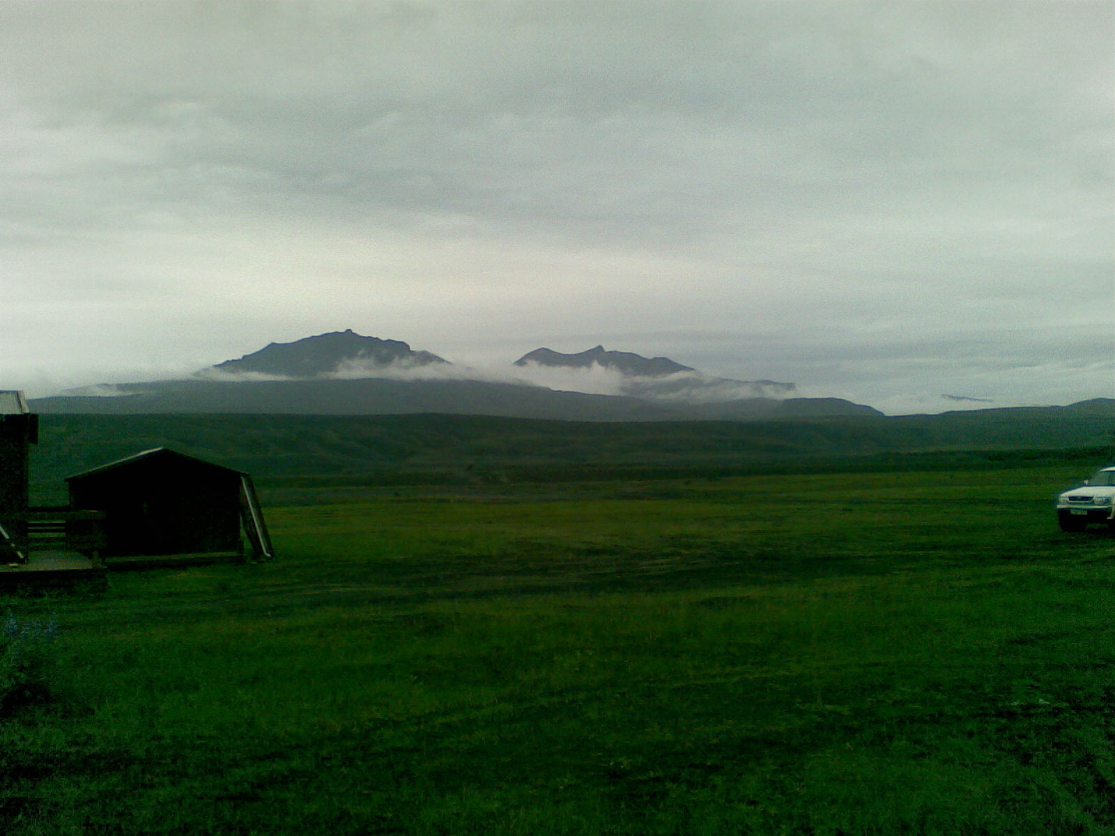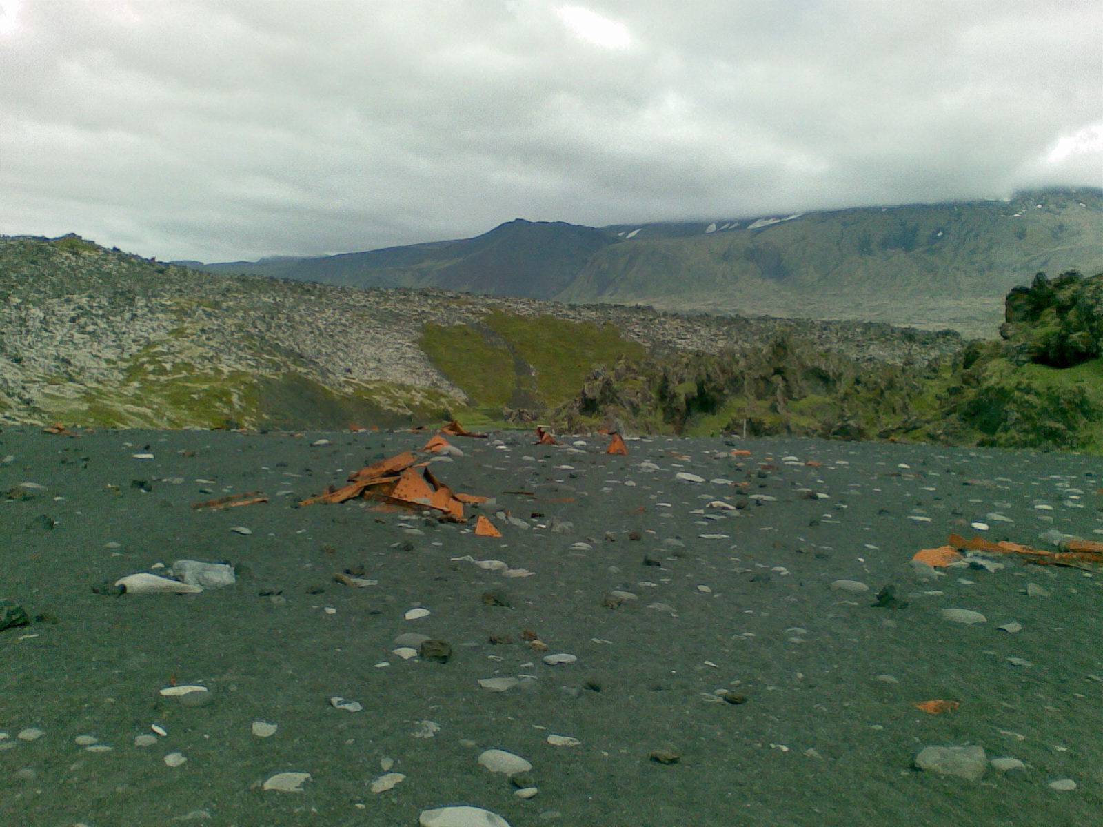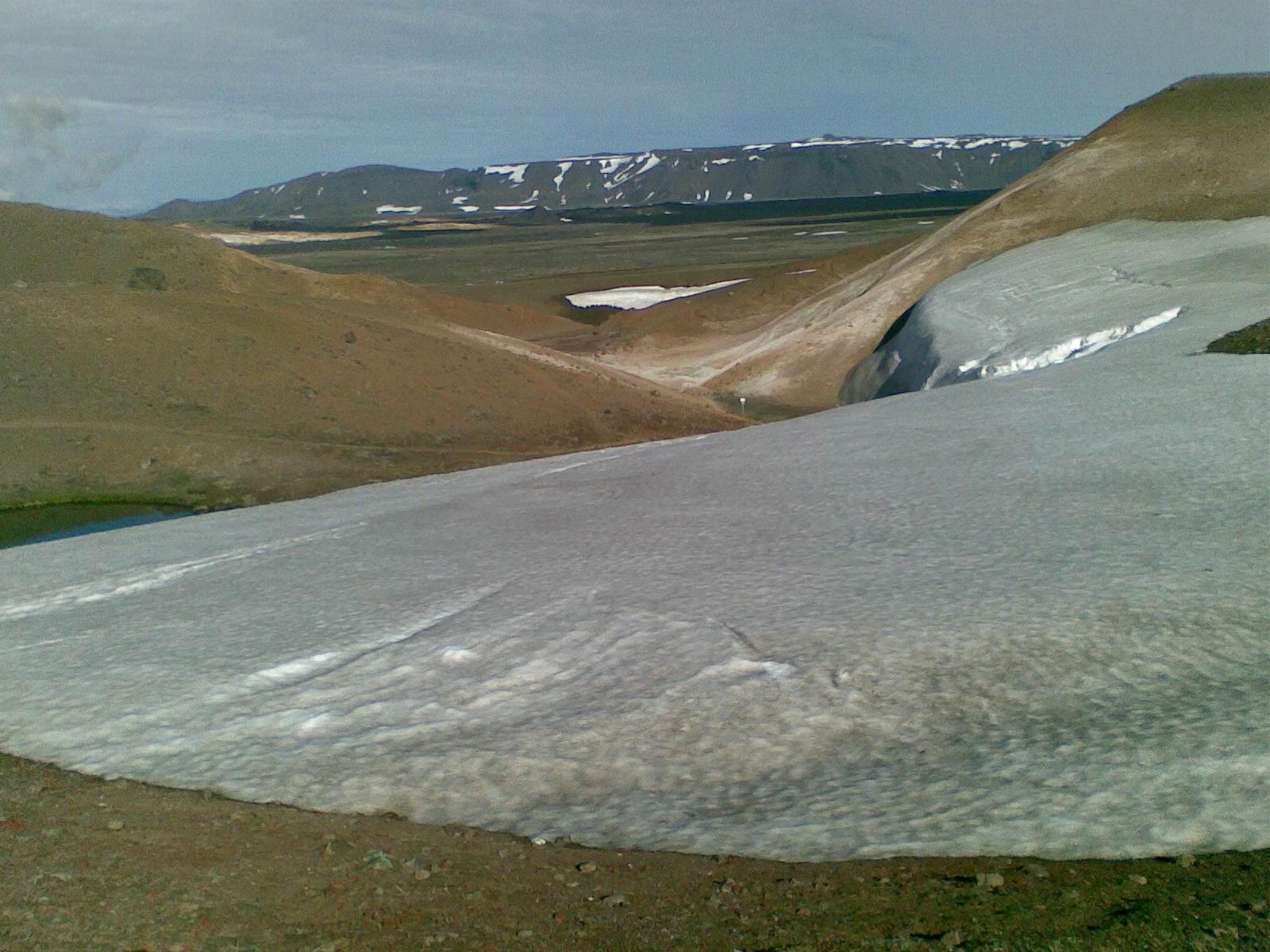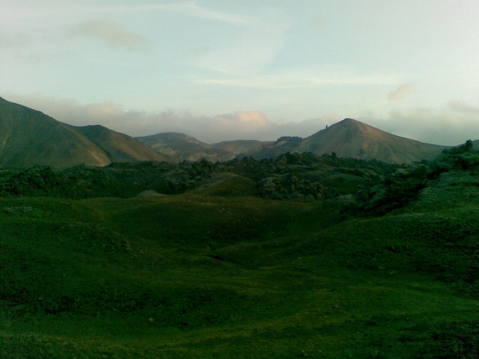 Het binnenland is meer vlak, op de uitgesleten rivier met watervallen na, en je hebt prima zicht op de witte vlekken op de kaart; gletcher #3 qua oppervlak en meer. Het gebied bij Landmannalauger is meer bergachtig, met wat leuke pieken om te fotograferen. De jeugdherberg/berghut is alleen duur, en niet voorzien van stopcontacten. De slaapzaal is echt gedeeld en zonder bedden, een unicum voor deze trip. Moet dus in Reykjavik fotos en verbindingen uitzoeken. Tevens wordt het een questie van liften naar de snelweg. Eerst maar eens avondeten maken. Wel nodig hier, want ik denk niet dat de bevoorrading is aangekomen sinds gisteren.