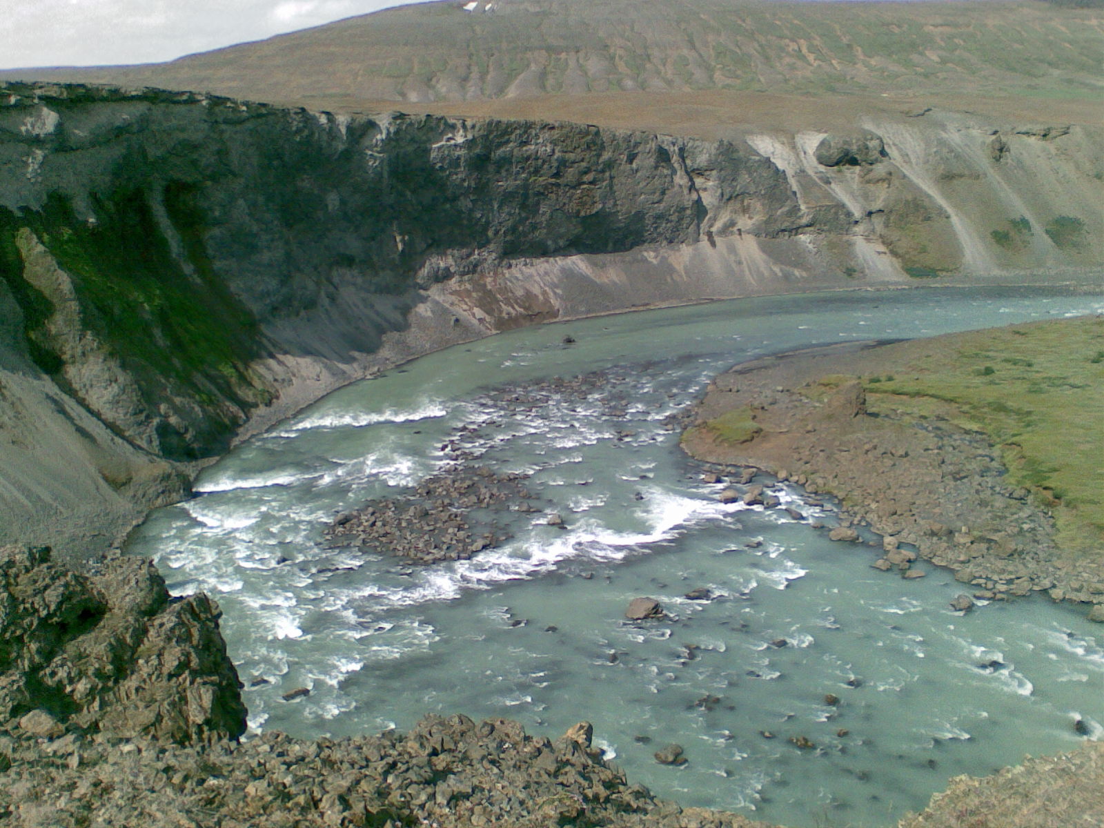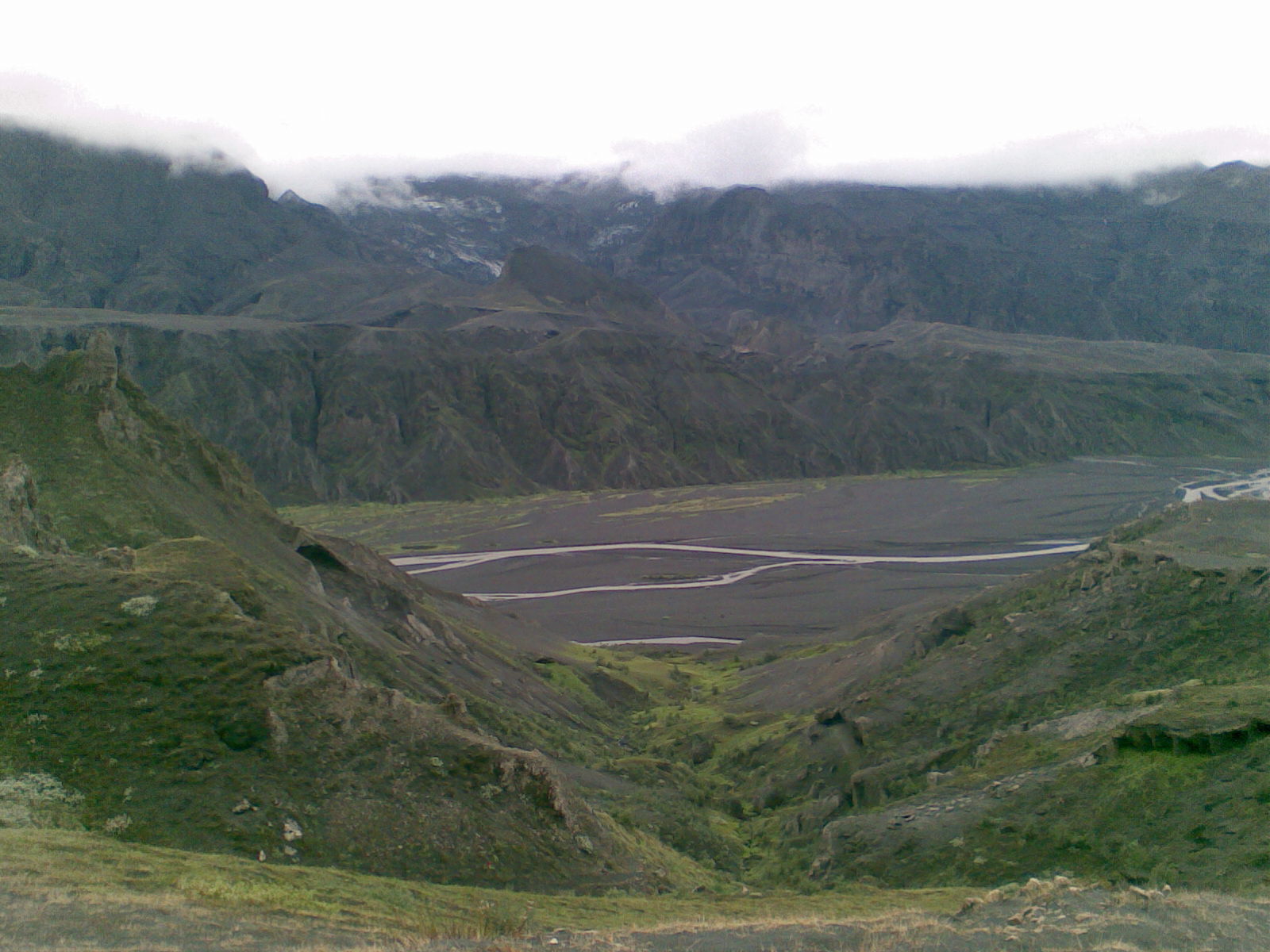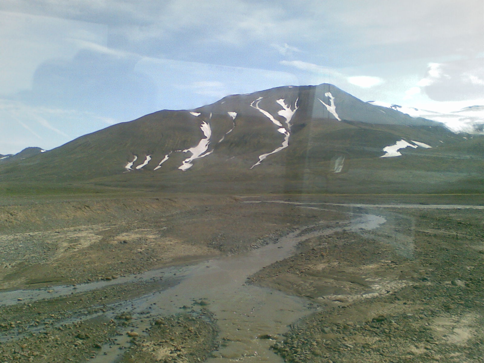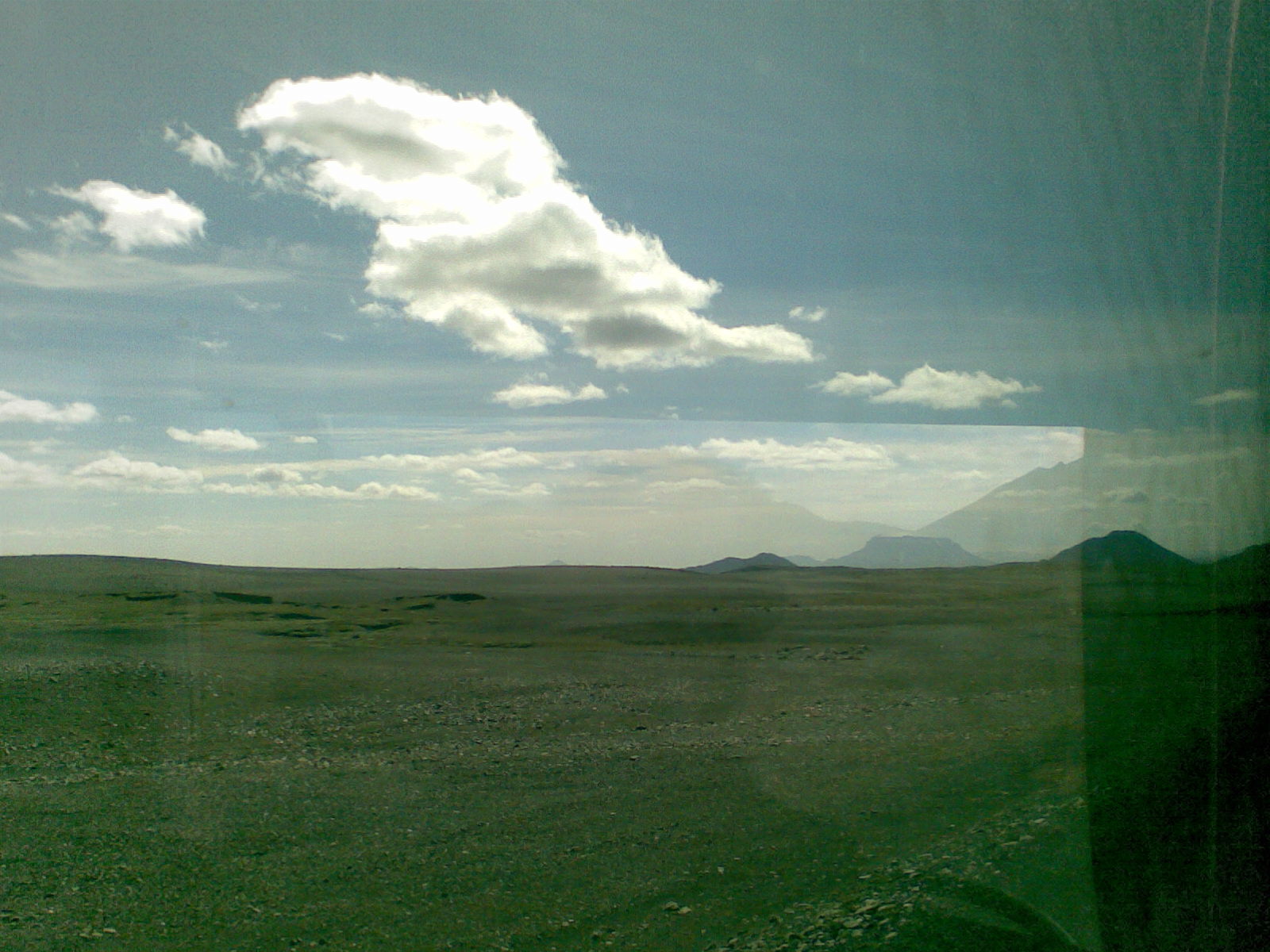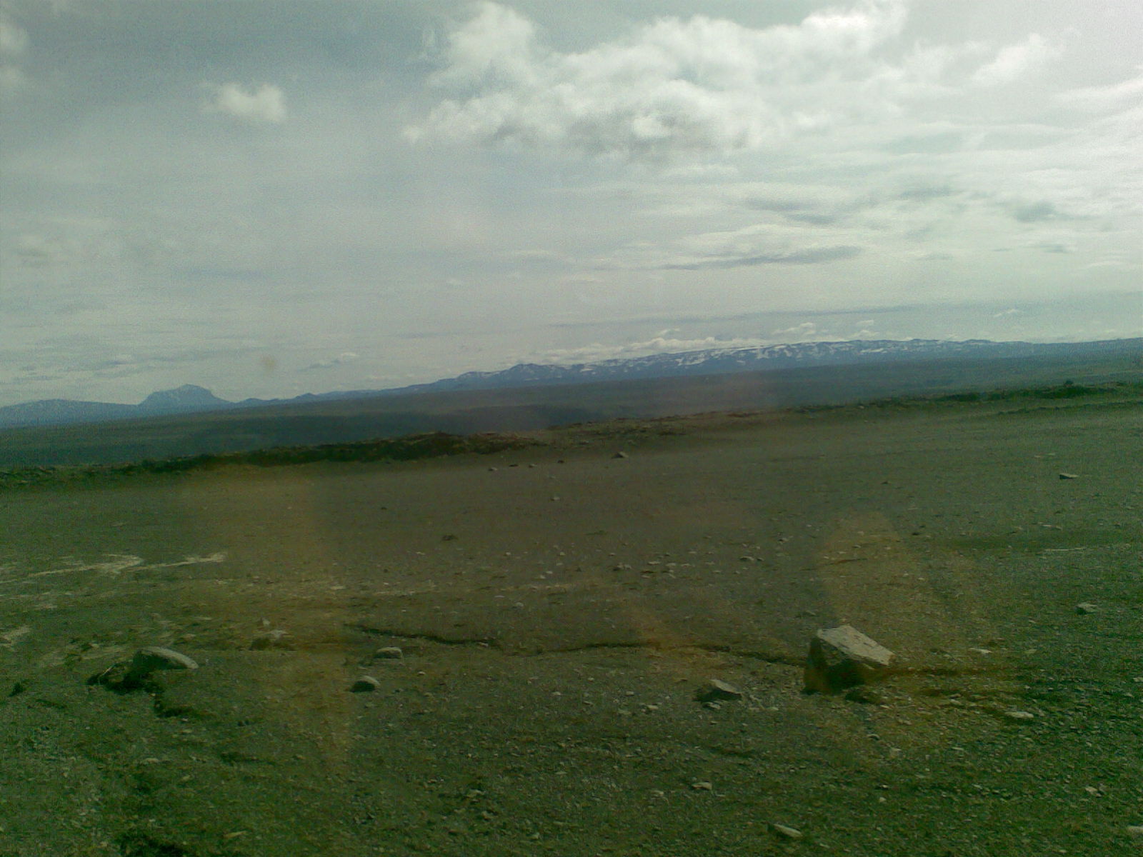Leuk dat de toko wifi heeft, maar tegen de hoofdprijs... Lijkt op de plek in Reykjavik; de prijs voor 10 minuten online was al oncomfortabel hoog, alleen was wifi daar gratis en de terminals/PCs duur. Vervolgens maar weer eens gaan genieten van de buitenwereld... 't blijft een merkwaardig landschap: stukken zien eruit alsof het einde der tijden gekomen en gepasseerd is, andere alsof lente (wat laat) is aangebroken. En weer andere volslagen normaal, op wat stof afnemen na. Tegelijkertijd is wel duidelijk dat er soms veel water afgevoerd moest worden... het dal is een groot stroomgebied.