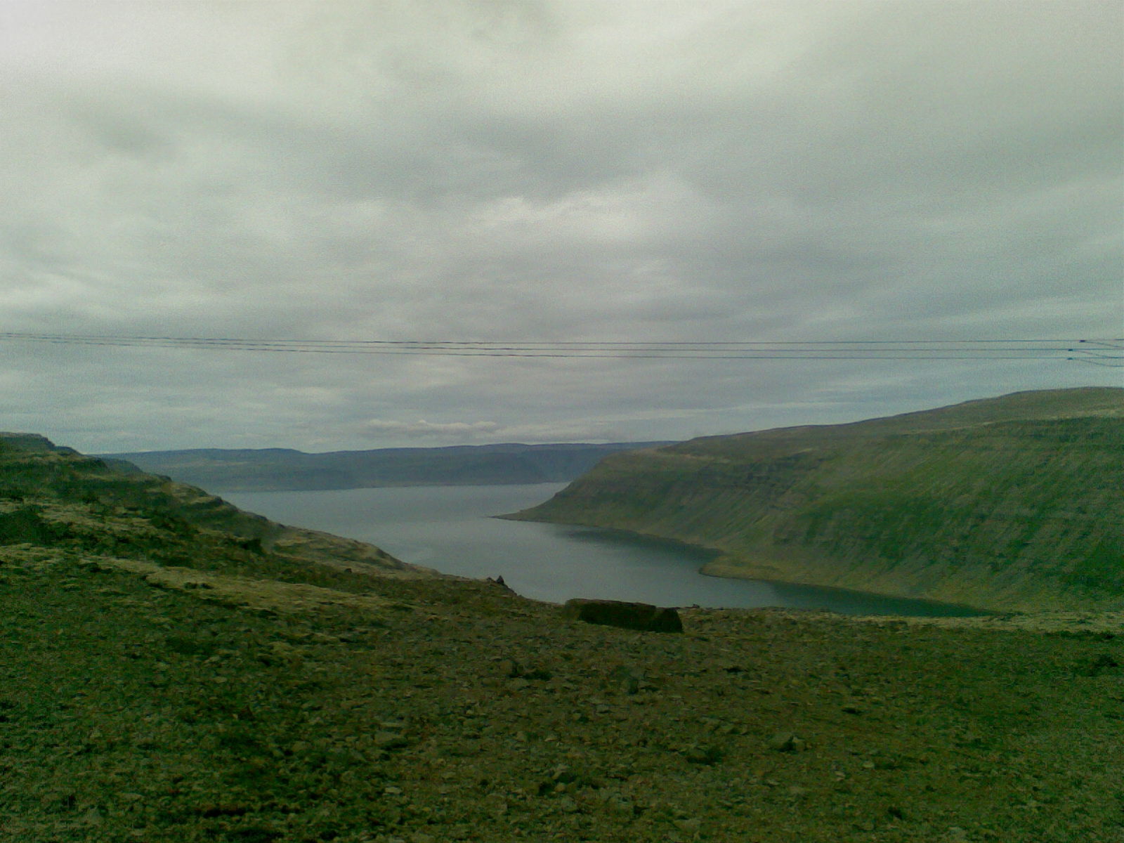 Het enige nadeel van een jeugdherberg is de hoeveelheid badkamers in de morgen... te weinig in dit geval. Daarna naar de boot afgereisd. Als iemand de "Oost Vlieland" mist, 't ding vaart nu tussen Stykkishólmer en Brjánslækur... Er is wifi aan boord, maar ze willen a) 1000 ISK en b) hebben een cap van 50 MB. Geen update dus via deze route... Vervolgens kom je met de boot aan in zo ongeveer niets. 't Zijn een paar loodsen bij de waterkant, een pier, en bij de hoofdweg iets dat een cafe is o.i.d. De dichtsbijzijnde plek de juiste richting uit is 6 km. Die dus maar gaan lopen, gezien de afwezigheid van alle openbaar vervoer.